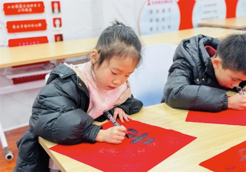 活动现场气氛热烈,小朋友们热情高涨,迫不及待地拿起纸笔,尽情挥毫。一个个形态各异的 “福” 字在笔下诞生,每一笔都饱含着他们对蛇年的独特理解,以及对新年的美好祝福与期待,充分展现出孩子们丰富的想象力、独特的视角和对美好生活的向往。小朋友们还互相欣赏作品,毫不吝啬地给予彼此赞扬。