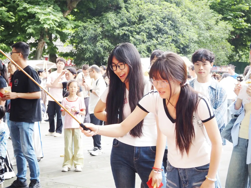 游园活动同样精彩纷呈,文庙中庭化身传统游戏的欢乐天地。趣味投壶吸引众多游客驻足挑战,大家在模拟古代礼仪娱乐活动中感受传统雅趣;幸运套圈游戏参与者可凭借游戏获奖券兑换精美的奖品,活动现场欢声笑语不断,节日氛围浓厚。