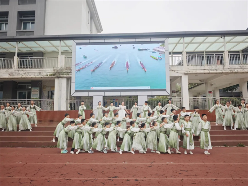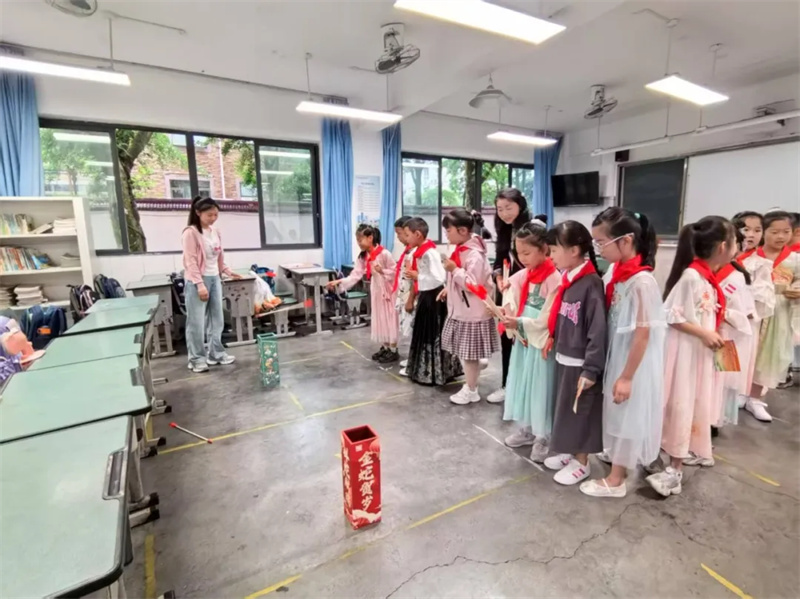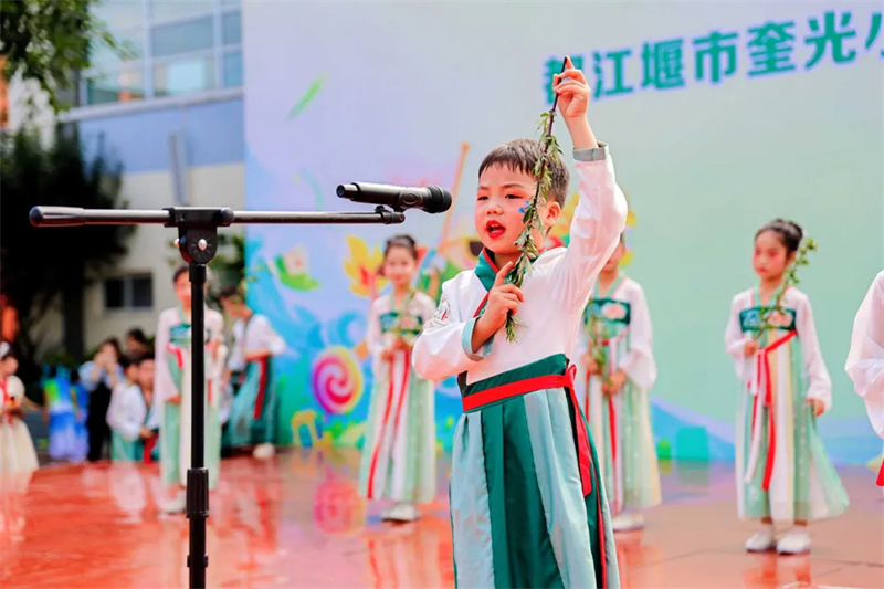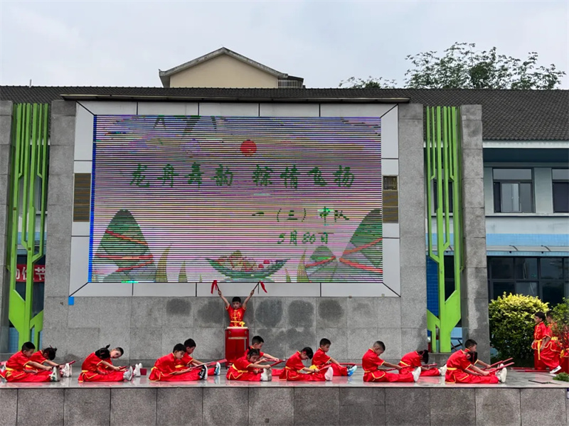 5月26日,泡桐树小学都江堰校区一(3)中队在升旗仪式上开展“龙舟舞韵,粽情飞扬”主题活动,同学们通过《书简舞》展现端午诗意,以《赛龙舟》表演再现竞渡场景,将艺术与教育融合。5月28日,二(7)中队举办“‘香’约端午 ‘锤’满温情”活动,邀请家长进课堂讲解端午文化,指导制作艾草锤和香囊,并让学生用自制的养生锤为家长捶背,在传承传统文化的同时融入感恩教育。两场活动以不同形式让端午文化浸润童心,厚植家国情怀。