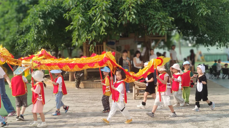 都江堰市青城山东软幼儿园开展以“趣玩药王会,童绘青城韵”为主题的端午节主题活动。青城娃娃们在“创绘青城”户外区域游戏中融入药王会元素,在本草园采收艾草,在本草集市支起草药摊,在大树营地煮上了本草药膳,在沙水乐园准备了“温泉药浴”,在都都建构搭建了药王庙,在都都剧场将端午舞龙巡演带到了幼儿园的各个地方……孩子们在趣味游戏中感受药王文化的魅力,体验端午传统习俗,更在幼小的心灵播下传统文化的种子,让非遗与童趣碰撞出灿烂的节日火花。