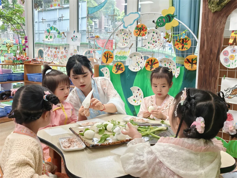 都江堰市向峨幼儿园开展了“汉服迎六一,经典润童心”端午主题活动。孩子们身着美丽的汉服,和老师一起制作传统美食,“浓情香粽”“艾草青团”“印花茶叶蛋”“咸香鸭蛋”……丰富的美食色香味俱全。孩子们不仅体验了制作经典美食的劳动乐趣,也懂得了与同伴分享的快乐,在好玩、好吃、好热闹的氛围下,走近中华传统文化,传承古人趣味,感受华服之美、文化之魅,让文化自信的种子悄然生根发芽。