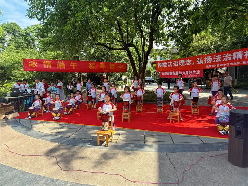 5月28日,都江堰市蓓乐幼儿园联合社区、丽水青城玫瑰苑小区党支部共同举办“浓情端午·粽享好礼”主题活动。活动现场,幼儿们带来了丰富精彩的表演。活力四射的啦啦操《ha ha ha》瞬间点燃气氛;古典舞《百舞惊鸿》中,孩子们身姿轻盈,尽显中华舞蹈之美;非洲鼓表演《五十六个民族》节奏激昂,传递民族团结之情。此次活动以多元表演为纽带,不仅为幼儿提供了展示自我的舞台,也加深了社区与幼儿园的联动,让传统节日焕发新活力。