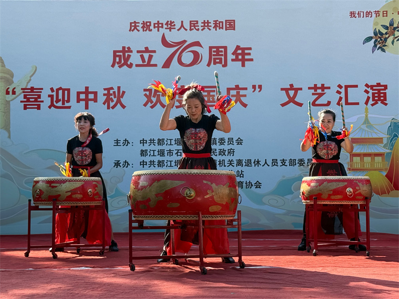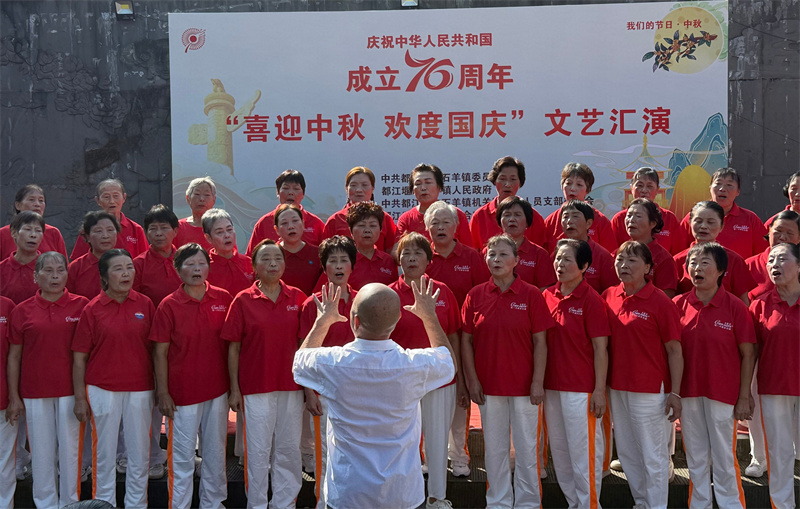 9月24日上午,都江堰市石羊镇三羊文化广场洋溢着喜庆祥和的节日氛围。为庆祝中华人民共和国成立76周年,喜迎中秋佳节,由石羊镇人民政府主办,石羊镇老年人体育协会等单位承办的“喜迎中秋 欢度国庆”主题文艺汇演在此举行。