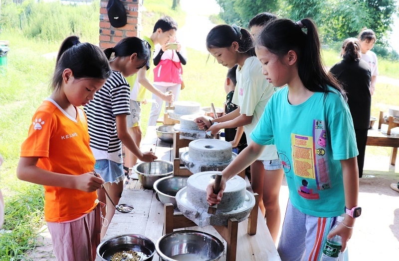 随后,孩子们在志愿者的带领下来到马安小镇,开展四川非物质文化遗产——富顺豆花的制作体验活动。豆花制作老师详细讲解了富顺豆花的起源和发展传承,介绍豆花制作的科学原理和各环节的工艺要求,现场演示并指导孩子们进行磨豆浆、点卤(凝固)、压榨等豆花制作实际操作。