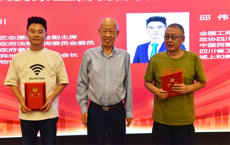 会上,商会新当选会长张建华为建川博物馆馆长樊建川、域上和美集团董事长邱伟颁发第三届名誉会长聘书。