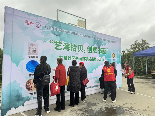 10月24日下午,由成都市青白江区城厢镇甘泉社区居民委员会主办,成都市青白江区亲馨家园综合服务中心承办的“艺海拾贝,创意书画”——甘泉社区书画结项成果展示活动在甘泉文体广场举行。本次活动吸引了约60名社区居民热情参与,为历时多期的“艺海拾贝”书画系列培训画上了圆满的句号。