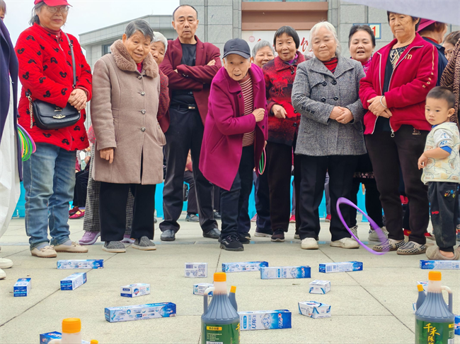 随后进入的互动游戏环节,瞬间点燃了现场氛围。踢毽子游戏一开启,不少居民重拾童年记忆,彩色的毽子在脚尖翻飞,欢笑声、欢呼声此起彼伏;套圈圈活动现场更是热闹非凡,居民们围得水泄不通,有人为同伴轻声支招,有人为每一次尝试高声鼓励,每当有圈稳稳套中目标,全场便会响起满堂喝彩,热闹的场景尽显邻里间的欢乐与融洽。