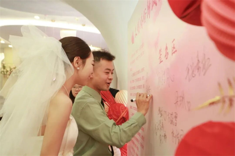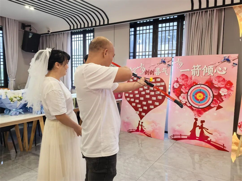 在非遗体验区,新人们共同制作宋锦饰品、手绘古风灯笼。一针一线间,是心与心的交流;一笔一画中,是情与情的交融。这些传统技艺不仅承载着文化记忆,更成为新人们爱情的信物。“一箭倾心”游戏区的欢声笑语,让这个雨天充满爱的温度。新人们在这里留下的不仅是笑脸,更是对婚姻的美好憧憬。启航:携手共建文明家园