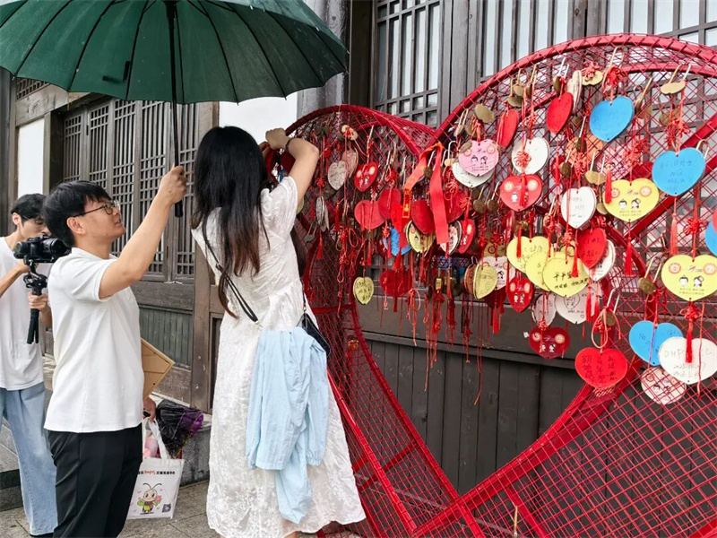 七夕浪漫市集同样精彩纷呈。6个特色主题花车集倡议宣传与暖心服务于一体:工作人员积极讲解文明婚俗理念,鼓励新人签署倡议、树立家风;文君酒、卡洛婚纱、桃子的花店、喜糖店及爱恋珠宝等爱心单位,也分别提供简约婚礼支持、环保喜糖、定制婚戒卡片及现金抵扣券等实用服务,以实际行动倡导重情轻礼、简约隆重的文明新风。每一份用心的服务都在诉说着:文明婚俗不是降低标准,而是让标准更有温度。