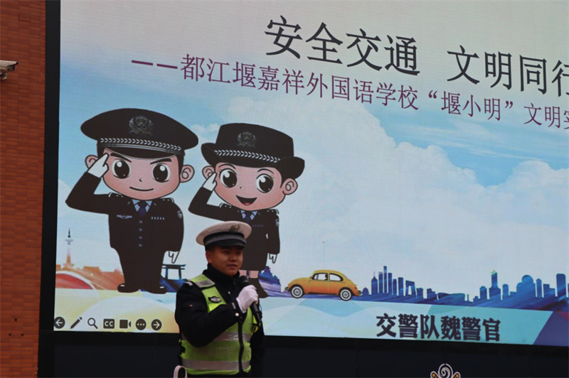 2024年12月9日,都江堰市嘉祥外国语学校开展“安全交通 文明同行都江堰市“堰小明”文明实践系列活动(二)‘堰小明’文明实践系列”活动。活动分为两个部分:首先,市交警队魏警官在学校升旗仪式上给孩子们带来一堂 《交通安全 文明同行》大课堂,通过观看交通安全视频,让同学们从安全行进、安全骑车、安全驾车等方面了解交通安全相关知识,遵守交通规则,更加珍惜生命;小学各班级播放《交通安全 文明同行》视频,通过主题微班会,呼吁家长和孩子们一起做“安全交通 文明同行 ”的践行者和守卫者。