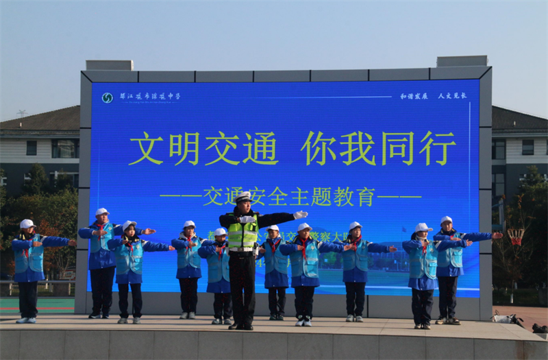 2024年12月16日,都江堰市锦堰中学联合都江堰市公安局交警大队开展了“堰小明”文明实践小分队系列活动——《文明交通 你我同行》,升旗仪式上七(三)中队的唐潇月同学在全校师生当中发出“文明交通 你我同行”的倡议。随后,全校师生一起观看了交通警示教育视频,交警大队覃亮警官针对师生上放学途中的交通安全作了专题指导。锦堰中学“堰小明”小分队的同学们也在兰浩警官的指导下学习了基本的交通指手势。