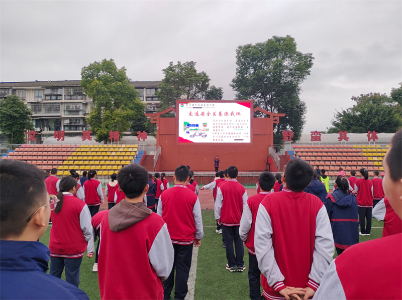 在第13个全国交通安全宣传日来临之际,都江堰中学开展了一系列交通安全宣传月活动。2024年11月18日,在交通安全日为主题的升旗活动上,首先由活动主持人介绍“全国交通安全日”的由来,随后,2027届团总支副书记陈雨桐同学作主题为《交通安全,生命的警戒线》的国旗下演讲。为进一步巩固全校师生的交通安全意识,2024年12月16日升旗仪式上,学校特邀请都江堰市交警大队警官周同超到校宣讲交通安全。周警官从行走篇、骑行篇、驾驶篇等多角度展示了在参与交通过程中常见的安全风险,同时结合都江堰本地的实际案例,深入浅出地讲解交通法律法规、交通安全常识,详细剖析交通事故发生的原因,以提高师生对遵守交通规则重要性的认识。