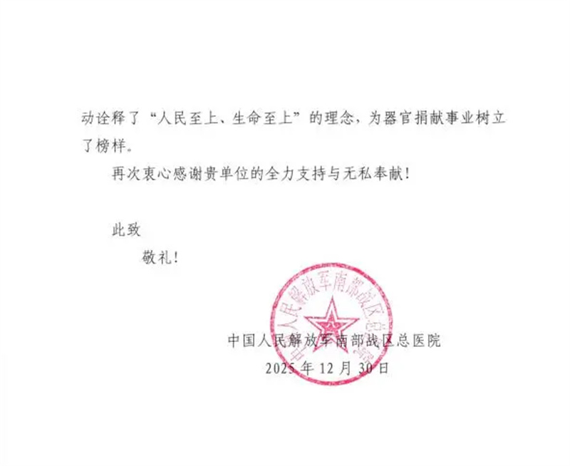 近日,四川省红十字会收到中国人民解放军南部战区总医院的感谢信,信中高度赞扬了四川省人体器官捐献管理中心在本次生命接力赛程中的大力支持和辛勤付出。