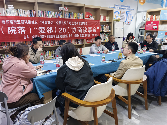 “爱邻议事”是社区创新搭建的民主协商平台,遵循“民事民提、民事民议、民事民决、民事民办、民事民评”原则,定期召集社区工作人员、社会组织代表、居民骨干及相关方共同议事。针对居民反映的突出问题,议事会坚持“一事一议”,通过现场沟通、实地调研、协商论证,推动问题解决。