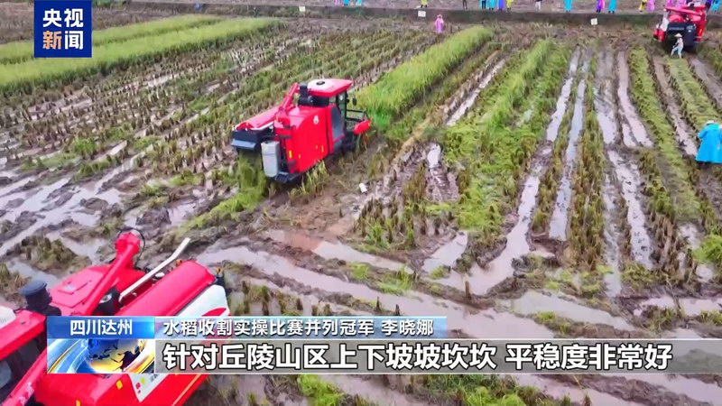 水稻收割实操比赛并列冠军 李晓娜:新收割机,它的平稳度比较好,动力十足,针对丘陵山区上下坡坡坎坎,平稳度非常好。