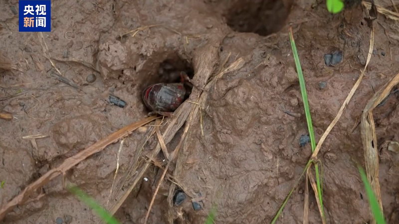 除了再生稻,在稻田里还能够看到小龙虾,在现场记者发现有很多小龙虾洞。