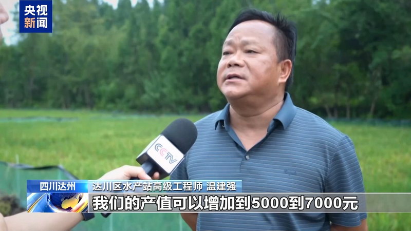 达川区水产站高级工程师 温建强:单纯种水稻,我们这里一亩产值不到2000元。如果实施了“稻田+”,我们的产值可以增加到5000到7000元。