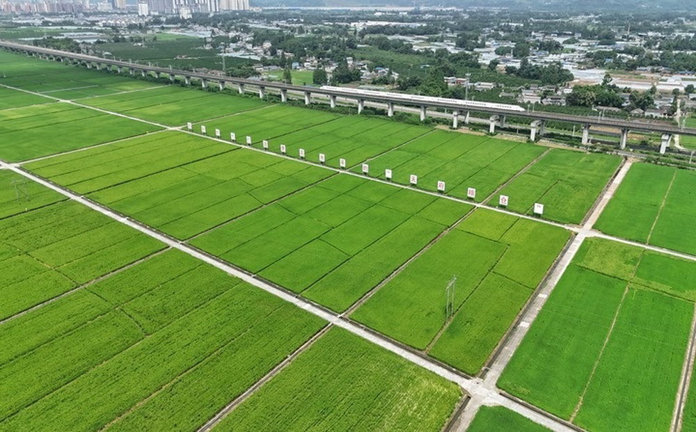 2024年7月26日,一列高铁列车从四川省眉山市永丰村高标准农田上方的高架桥上疾驰而过。新华社记者 刘坤 摄