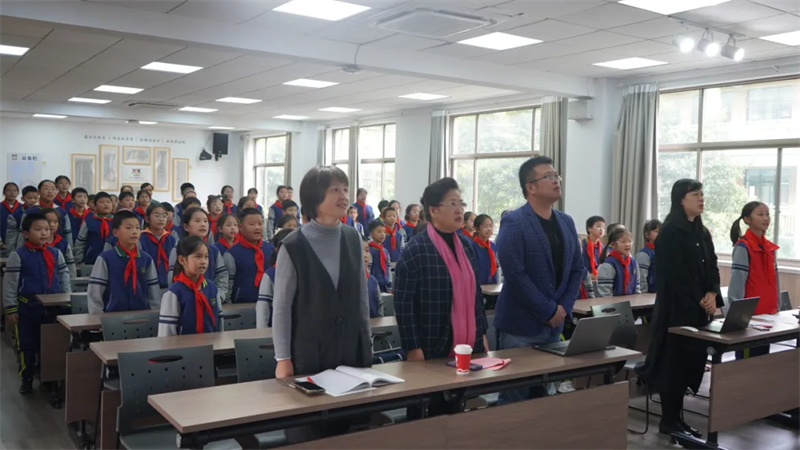 在嘉兴市秀城实验教育集团钧儒小学的主会场,学校少先队员代表齐聚一堂。伴随着庄严的国歌声,升旗仪式拉开序幕。两地互联网同步举行升旗仪式,全体少先队员高唱国歌。“国旗在我心中”不仅是仪式的主题,更是融入血脉的信仰。