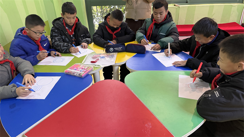 随后进行的“我说你画”环节,同学们根据老师的语言描述自由创作图画。课后,小组内评选出“最像一幅画的作品”与“什么都不像的作品”。艾老师引导大家认识到,这不仅是艺术表达,更是内心的投射——画面越符合描述,往往反映孩子内在的自我要求较高、压力较大;而更自由、更抽象的创作,则常对应着更轻松的心理状态。这一设计让在场师生直观感受到艺术与心理的深层联结。