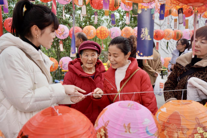 在通江县列宁公园,设置了两大特色体验区域,踢毽子、红色知识竞答、投壶、猜灯谜等互动项目有序开展。参与者手持集章卡闯关打卡,完成项目即可集章兑奖,在趣味体验中重温红色历史、感受民俗魅力,吸引了众多亲子家庭、青少年踊跃参与。灯谜区内红彤彤的谜面琳琅满目,内容涵盖红色文化、民俗常识、诗词典故等,市民或驻足思索或结伴探讨,现场热闹非凡、年味浓郁。
