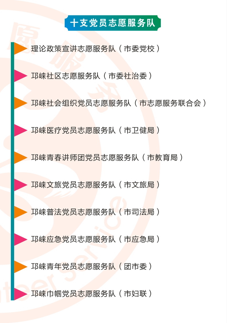 邛崃市多家单位立足岗位、率先垂范,成立了首批十支党员志愿服务队伍:理论政策宣讲志愿服务队、社区志愿服务队、社会组织党员志愿服务队、医疗党员志愿服务队、青春讲师团党员志愿服务队、文旅党员志愿服务队、普法党员志愿服务队、应急党员志愿服务队、青年党员志愿服务队、巾帼党员志愿服务队。