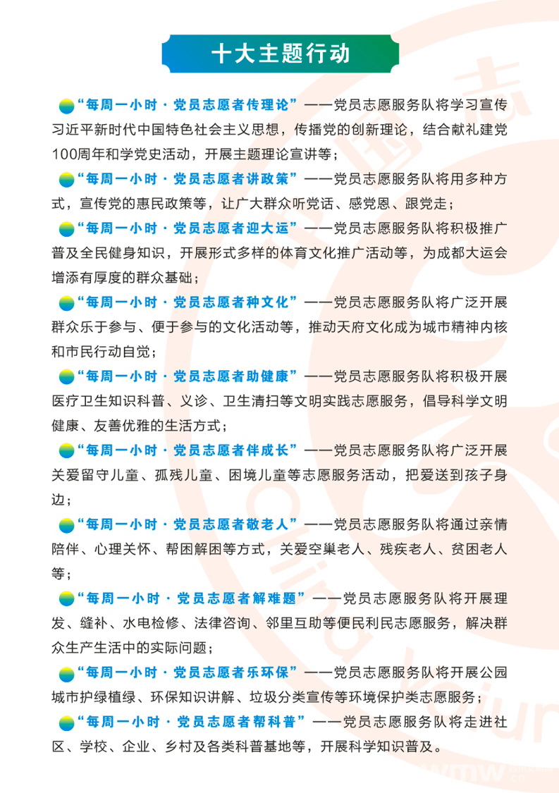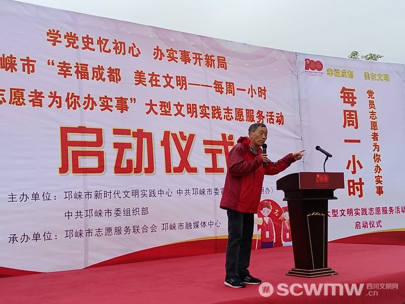 启动仪式上,市文明办负责同志发布了邛崃市“每周一小时 党员志愿者为你办实事”文明实践志愿服务十大项目:党员志愿者传理论、党员志愿者讲政策、党员志愿者迎大运、党员志愿者种文化、党员志愿者助健康、党员志愿者伴成长、党员志愿者敬老人、党员志愿者解难题、党员志愿者乐环保、党员志愿者帮科普。