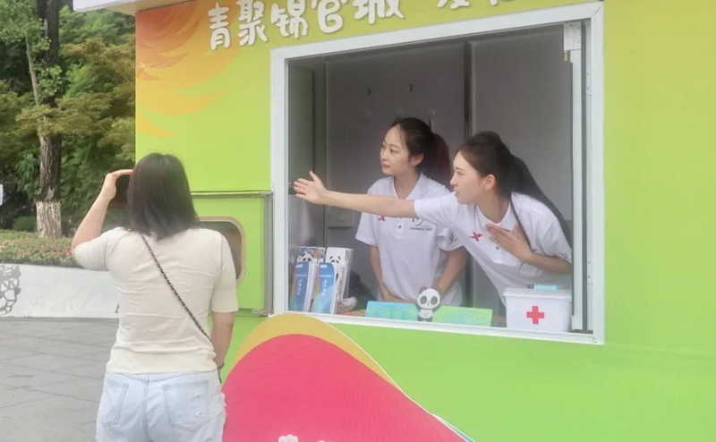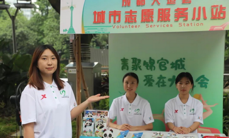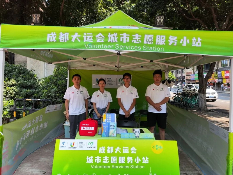7月20日,由30支志愿服务队伍、555名城市志愿者,组成的30个城市志愿服务小站在成华区启动运行。这些城市志愿服务小站以成都大运会会徽色系中的绿色为主色调,翠色帐篷绿意盎然,成为了成华区展现成华魅力和志愿风采的靓丽“窗口”,每个小站都配备了大运会宣传手册、急救箱、防暑药品等物资。“小青椒”们则以专业的精神、友善的微笑,在赛事场馆周边、交通枢纽、特色街道、商圈景点等,为市民游客提供赛事咨询、城市宣传、便民服务等志愿服务,助力成都大运会举行。