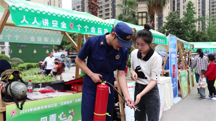 “干粉灭火器在使用的时候要先晃动一下,然后拿掉铅封,拔下保险栓,左手握着喷管,右手按住压把,在距离火源两米的地方用力压下压把,将喷管对准火源来回晃动,直到火焰被扑灭。”在青白江区“一见青心·集你所愿”文明集市文明实践活动现场,区消防救援大队官兵正在为市民耐心讲解干粉灭火器正确使用的方法步骤。本次活动吸引了青白江区10余个区级部门以及多家社会组织“出摊”。