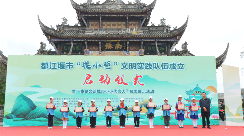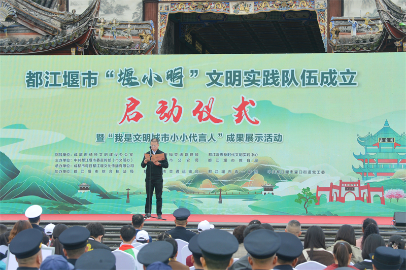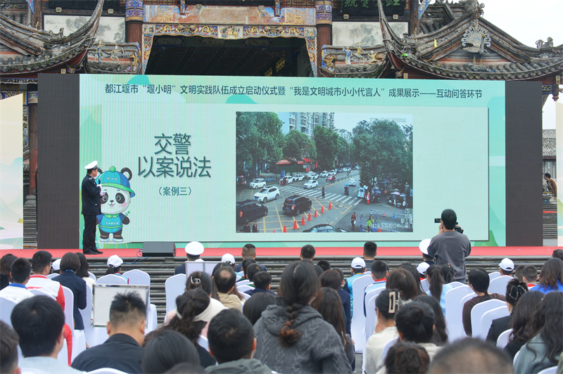 活动现场,各级文明单位、文明校园、文明村镇代表与交通警察、旅游警察、交通劝导员、环卫工人、出租车司机、公交车司机、快递员代表等400余人共聚一堂,分享文明交通知识、学习警示案例、倡导文明交通,形成全社会全行业共塑文明浓厚氛围,展现全国文明城市内生动力。都江堰市委宣传部(市文明办)主要负责同志发表致辞说:“举行都江堰市‘堰小明’文明实践队成立启动仪式暨‘我是文明城市小小代言人’成果展示活动,既是一次推进社会主义精神文明建设的重要探索,更是一次勇立潮头谋划推动都江堰市改进创新全国文明城市创建、文明实践、文明交通发展的积极实践。近年来,都江堰市在省委、成都市委的关心和支持下,坚持经济社会发展和精神文明建设‘两手抓、双提升’,不断丰富群众精神文化生活,不断增强人民群众获得感、幸福感、认同感,加快推动精神文明和物质文明协调发展,成为成都市唯一一个,四川省仅有的四家之一县级全国文明城市,更成为向每年3000万过境游客展现文明天府、文明蓉城良好形象的重要窗口。”
