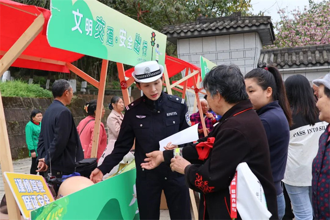 在文明交通·安全出行摊位,交警通过趣味互动与实用讲解,为百余名村民送上“安全锦囊”。交警通过实物对比、模拟实验展示合格头盔的重要性,现场还为大家发放反光手环,演示“举手示意过街法” 助力老人安全出行。