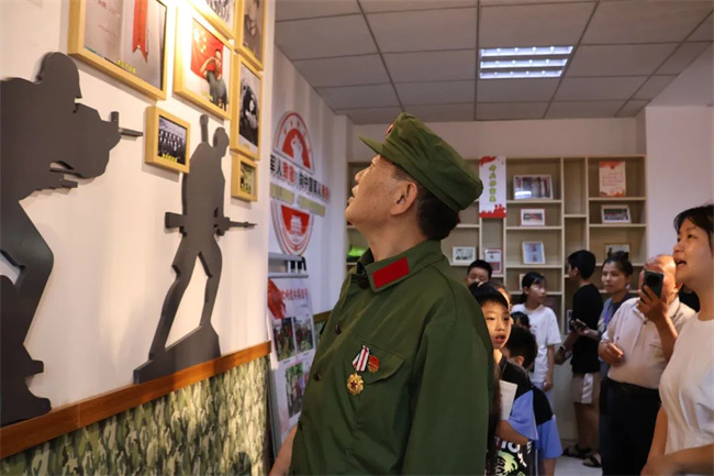 在“老兵之家”展区,退役老兵罗华手指着一张张泛黄的照片,讲述背后的烽火岁月——戍边卫国的坚守、战友的牺牲、荣誉背后的责任。当孩子们轻轻抚摸军功章时,他语重心长地说:“我们那一代人用鲜血和行动完成了祖国交给的任务,你们这一代的责任,就是好好学习,将来为国防建设贡献自己的力量!”