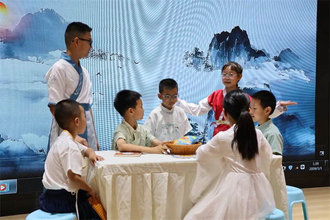 最亮眼的当数剧本演绎环节。《孝心小帮手》里,孩子们用90度鞠躬接菜篮的暖心举动,让不少家长感动不已;《诚信小超市》中,小美拱手承诺、欠身认错,“与朋友交,言而有信” 的诵读声回荡全场;《兄弟让梨新编》里,兄妹从拉扯零食盘到行礼相让,“兄道友,弟道恭”的合诵满含温情。三部改编自经典的情景剧,将“孝悌忠信”融入现代生活,孩子们真挚的表演让国学智慧焕发生机。