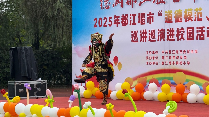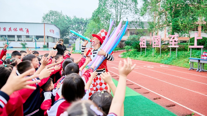 本次活动特别注重推动中华优秀传统文化进校园,通过一系列精心编排的文艺节目,让传统文化的种子在孩子们心中生根发芽。舞蹈《长安三万里》展现中华文明的博大胸怀;杂技《小丑先生 快乐厨房》的诙谐表演引得孩子们开怀大笑;源自本地的《青城柔术》表演,展示了刚柔并济的传统技艺;魔术《妙手生花》在眨眼间变幻出缤纷花海,全场惊呼;歌曲《小美满》的温馨旋律传递着平凡生活中的幸福;而川剧《变脸》演员走下舞台与学生互动,变幻莫测的脸谱在孩子们面前瞬间转换,将现场气氛推向顶点。穿插其中的有奖问答环节更是让孩子们在趣味互动中加深了对道德知识的理解。