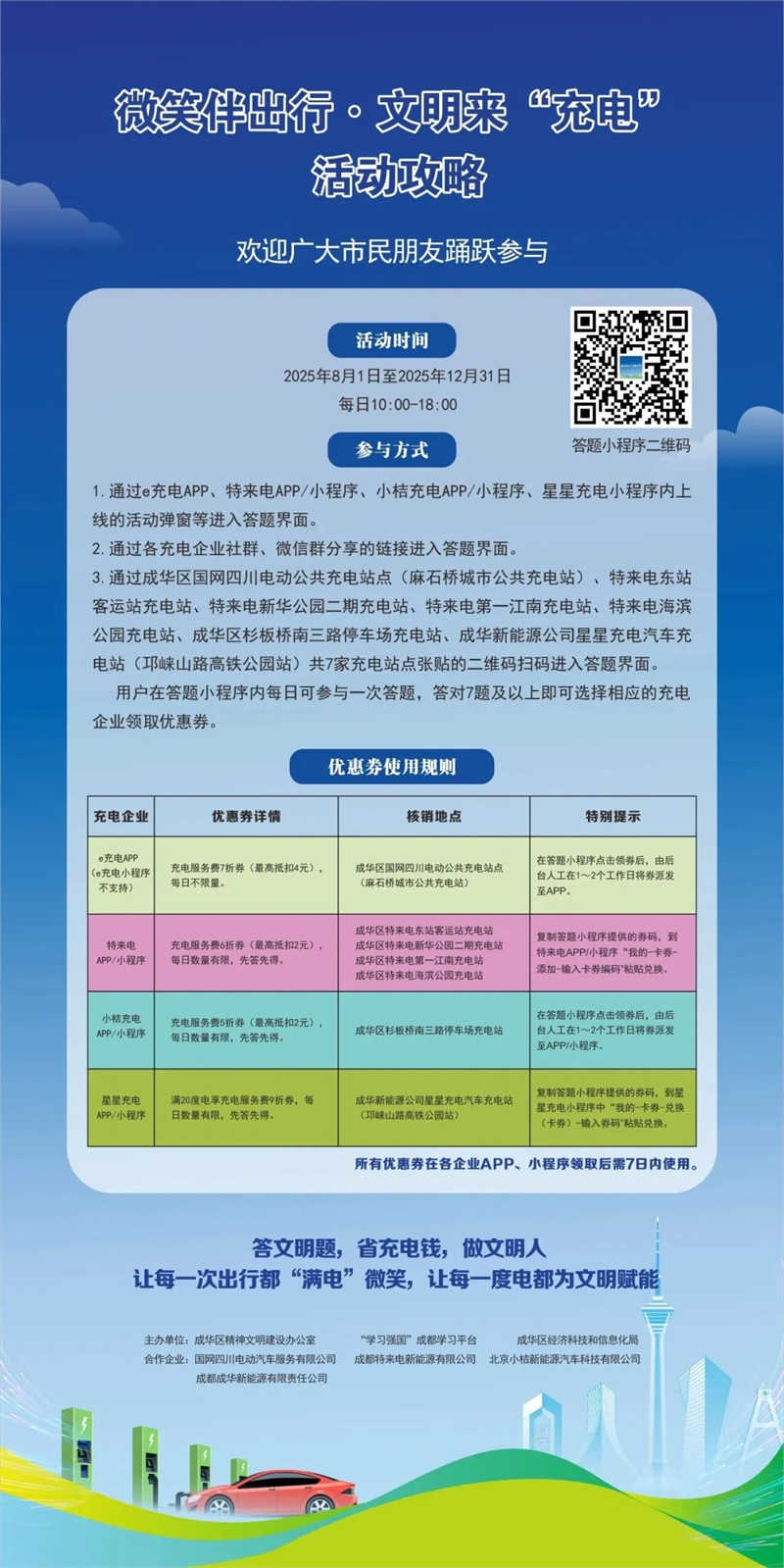 这场由成华区精神文明建设办公室、“学习强国”成都学习平台、成华区经济科技和信息化局联合主办,国网四川电动汽车服务有限公司、成都特来电新能源有限公司、北京小桔新能源汽车科技有限公司、成都成华新能源有限责任公司共同合作开展的活动,巧妙将线上答题与线下充电场景结合,让市民在充电间隙参与交通安全、文明礼仪等主题的答题,进而获得充电优惠券,实现文明提升与实惠出行的双赢。