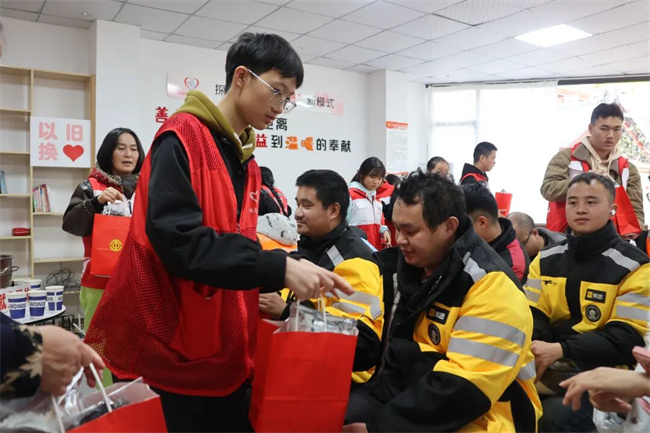 步入驿站,一股浓郁温暖的姜茶香气便扑面而来,瞬间驱散了从室外带来的寒意。志愿者们面带亲切笑容,一边将一杯杯冒着热气的姜茶递到外卖小哥手中,一边送上真诚的问候:“天气冷,辛苦了,快喝点暖暖身子!”这份关怀,让终日奔波在寒风里的骑手们倍感温暖。他们暂时放下忙碌,围坐在一起,一边小口喝着驱寒的姜茶,一边轻松地聊着天。随后,工作人员派发由护膝、暖宝宝、手套等组成的温暖礼包,将这份实实在在的关怀延续到他们往后的奔波路上。