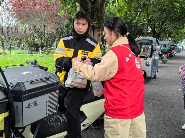 活动当天,志愿者们提前熬煮好热姜茶、分装打包,穿上红马甲后前往五彩广场,为户外奔波的新就业群体送上“热乎礼”。“冬日辛苦啦,喝杯姜茶暖暖身!”面对快递员、外卖骑手们,志愿者微笑送上姜茶。寒风里,姜茶既暖手,更温暖了奔波的心。