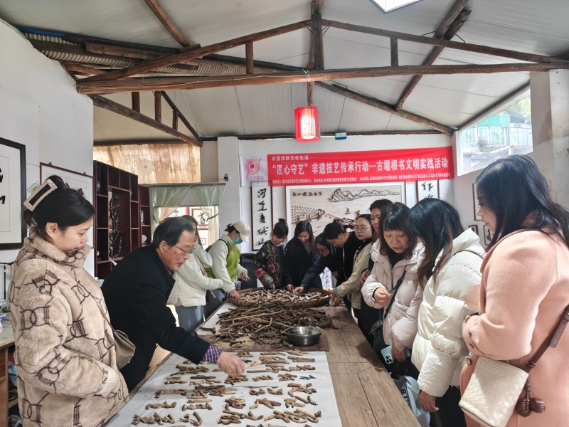 活动现场,国家级根书非遗传承人为到场观众带来了精彩的根书文化讲座。他以“一根一世界,一书一匠心”为切入点,结合自身创作经历,从根书的起源演变、选材技巧、造型构思到工具使用,进行了细致讲解。“根书创作讲究‘顺势而为’,要尊重树根的自然形态,在保留其原生肌理的基础上,融入书法的笔法神韵,每一件作品都是自然与人文的完美契合。”讲座过程中,非遗传承人现场展示了《家和万事兴》《松风竹韵》等经典根书作品,虬曲的树根经过巧妙雕琢,化作苍劲有力的笔墨线条,引得在场观众阵阵赞叹。