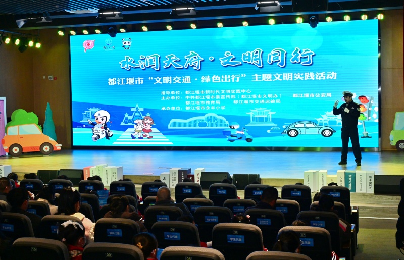四川文明网成都讯(都江堰市文明办)为持续提升市民文明素养,凝聚“文明交通·绿色出行”社会共识,引导广大市民游客主动成为文明交通的宣传者与践行者,12月2日,由都江堰市新时代文明实践中心指导,都江堰市委宣传部(都江堰市文明办)、市公安局、市教育局、市交通运输局联合主办,都江堰市永丰小学承办的“水润天府·文明同行——都江堰市‘文明交通·绿色出行’主题文明实践活动”在永丰小学举行。市级相关单位分管负责同志、15所“堰小明”中小学校分管负责同志、永丰小学师生代表及家委会代表等约400人齐聚,共同参与此次文明实践活动。