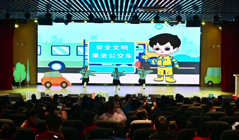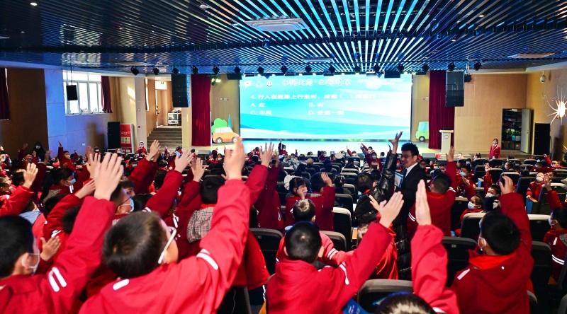 活动现场,永丰小学汇报2025年“堰小明”文明实践工作开展情况,让现场观众直观感受到永丰小学在文明交通工作的扎实成效。永丰小学师生精心编排的节目——《红绿灯下的约定》,用身边文明交通案例故事,生动演绎了“文明出行”的核心理念,赢得现场阵阵掌声。《以案说法》环节,市公安局交警通过视频展示交通违章案例,结合随机街拍的采访素材,深刻揭示不文明交通行为的危害,引发全场人员深思,结合案例视频开展交通知识培训,细致讲解交通法规要点与安全出行注意事项,为在场人员送上实用的“文明交通安全宝典”。互动问答环节,现场观众踊跃选题作答,进一步熟悉和掌握了文明交通相关知识,在轻松的氛围中巩固了交通安全知识。最后,交警、家长及学生代表共同宣读文明出行倡议,铿锵有力的誓言彰显了全民践行文明交通的坚定决心,将活动现场氛围推向高潮。