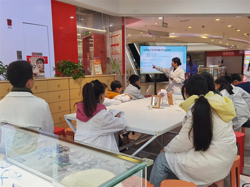 二楼的文明商家点位变身文明实践互动课堂。在医康眼镜店,孩子们秒变“小小验光师”,在专业人员指导下学习爱眼护眼知识,亲手操作验光设备,在实践中理解健康用眼的重要性。一旁的领城星街舞场地内,孩子们在跃动的节奏中完成指定舞蹈动作,并响亮说出三种文明行为,将艺术体验与文明教育完美结合。