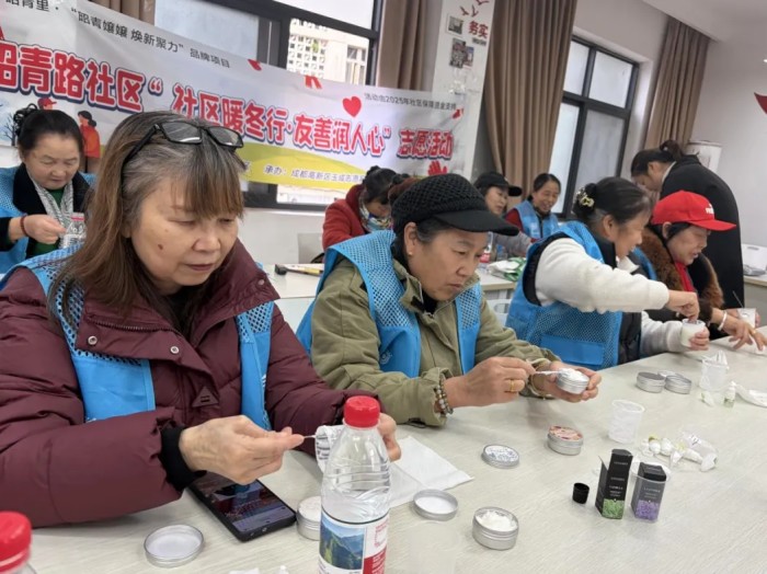 活动现场,志愿者们在专业人员的指导下,有条不紊地完成原料配比、搅拌调制、灌装成型等工序,制作出一份份护手霜。随后,大家分组走上街头,将护手霜与防护口罩送到环卫工人、快递员等户外劳动者手中,为他们送去冬日的温情与关怀。“没想到社区还惦记着我们,这护手霜闻着香、摸着润,心里特别暖。” 收到礼物的环卫大姐感动地说道。