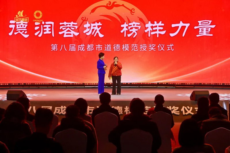 在成都,总有人用平凡点亮微光,用善意传递幸福。12月22日,由市委宣传部、市委政法委、市文明办、成都警备区政治工作处、市总工会、团市委、市妇联联合主办,成都市广播电视台承办的“德润蓉城 榜样力量”第八届成都市道德模范授奖仪式在成都电视台演播厅举行,为50人(组)来自各行各业的道德模范授奖,并分享他们的故事。授奖仪式分为敬业奉献、助人为乐、孝老爱亲、见义勇为、诚实守信五个篇章,生动诠释了恪守职责的时代高度、友善公益的烟火温度、温情守候的幸福长度、勇毅担当的城市亮度、一诺千金的人文厚度,高尚的个人品德与城市文明相映成辉,书写温暖生动的时代注脚,勾勒出 “崇德向善的人文成都” 最美轮廓。