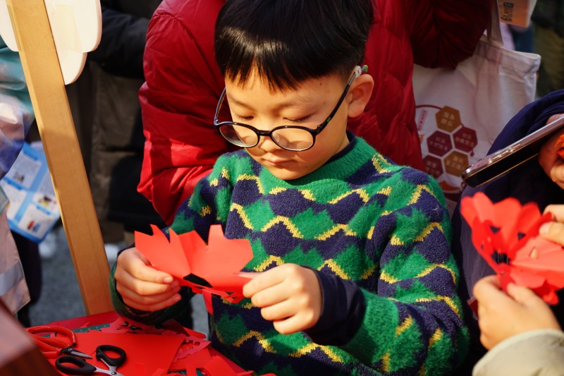 演出的余韵还在空气中流淌,便民服务区就已化身一片热气腾腾的体验“热力场”:新春送“福”区墨香四溢,书法志愿者将温暖祝福融入字里行间;社科赠书区备好各类书籍现场赠送,活动现场书香扑面;垃圾分类游戏与“圈住文明”趣味互动,让文明理念在欢声笑语中悄然传递。文明养犬主题画展、非遗糖画与剪纸体验、应急救护科普、口腔义诊……整个服务区充满活力,居民在参与中收获温暖,在体验中与文明同行。