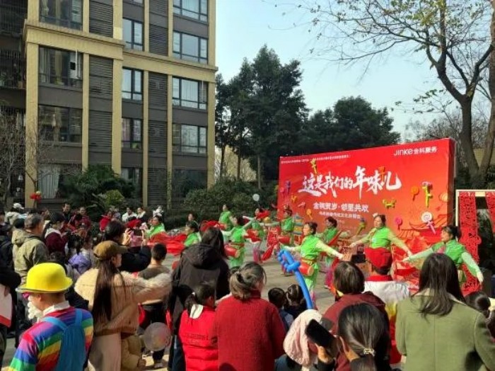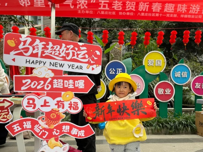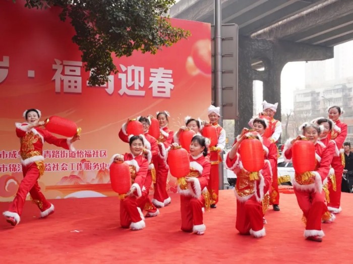 2月6日,府青路街道怡福社区举办“怡启新岁·福马迎春”新春同乐会。现场张灯结彩、热闹非凡,腰鼓舞、锅庄舞、川剧变脸、诗朗诵等节目精彩纷呈,展现了居民的多才多艺与积极向上的精神风貌。活动还穿插了融合春节习俗与安全知识的有奖问答,营造出喜庆、祥和的新春氛围。