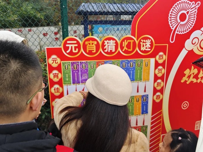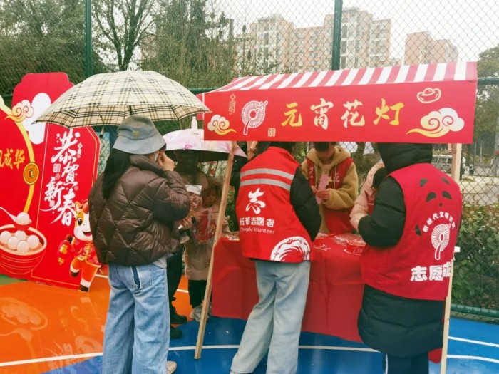 不远处,“文明灯谜会”的五彩灯谜条随风摇曳,谜面巧妙融入元宵民俗和社会主义核心价值观知识。居民们或驻足凝思,或结伴探讨,猜中者喜笑颜开,现场欢声笑语不断。