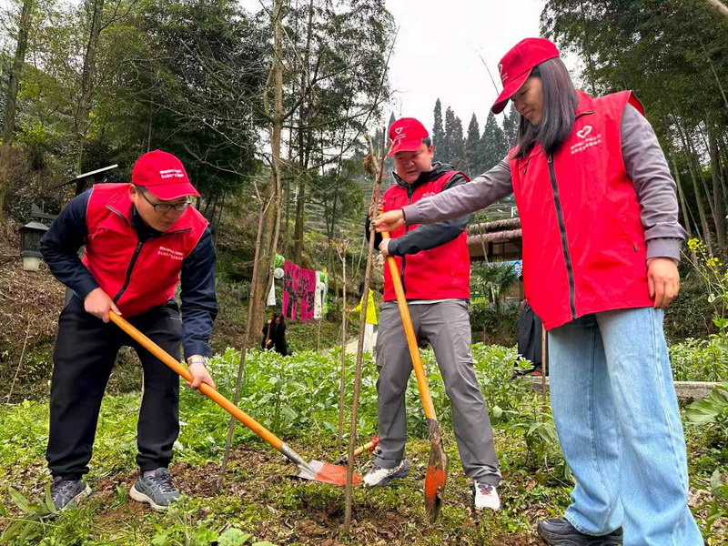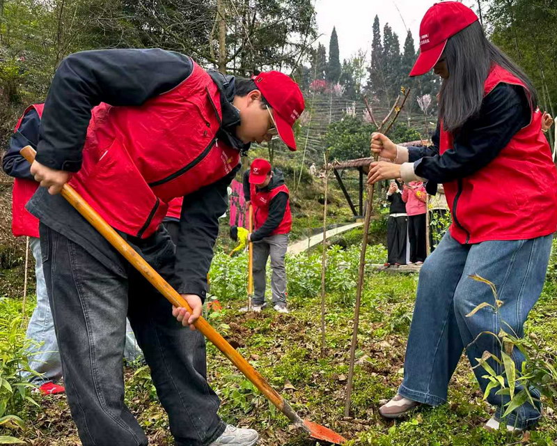 现场植树环节,在专业技术人员指导下,大家分工协作、一丝不苟,挥锹铲土、扶正树苗、填土浇灌,在茶园间种下新苗,用双手为茶溪谷增添新绿。这一系列植绿护绿的行动,不仅是在美化生态环境,更是在为涵养水源、净化水质、保障都江堰水资源筑牢生态根基,让每一株绿植都成为守护珍水的微小屏障,让植绿护绿的实践行动,成为珍水护堰的具体抓手。“通过活动,我们真正理解了‘护绿就是珍水’的含义。每一棵树都是一座小型水库,保护好植被就是在守护我们的水源。”第八届全国文明单位拟培育单位──国网岷江供电公司文明实践者姚梅利说道。