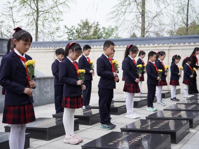 成都市成华区嘉祥外国语学校小学、初中、高中三个学部,分别以 “缅怀革命先烈 传承红色基因”“家国永念 少年承志”“一缕清风 拥山河安明”为主题,相继前往院山坡烈士陵园开展清明祭英烈活动。