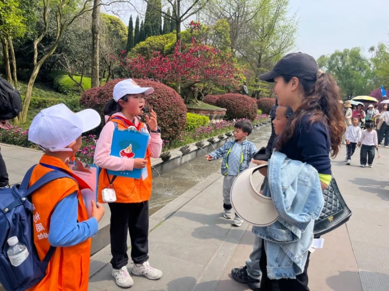 清明假期,游客众多。上岗后的“小橘子”们迅速进入角色,在景区的不同角落开展服务。在离堆公园,他们担任小小讲解员,向游客讲述李冰治水智慧和都江堰水利文化;在堰功道,他们担任安全引导员,为游客提供帮助;在伏龙观,他们引导游客文明参观;在张松银杏旁,他们设立移动咨询服务点,为游客指路答疑。