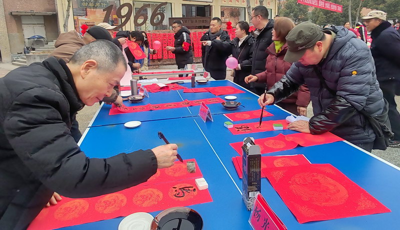 随后进入温馨的送春联环节,本地书法家现场挥毫泼墨,为志愿者们书写定制春联。红纸铺展,墨香流淌,“蛇辞旧岁平安驻 马迎新春喜乐来”等饱含祝福的联语跃然纸上,既传承传统文化,又寄托对志愿者们深耕厚植、服务社会的勉励。